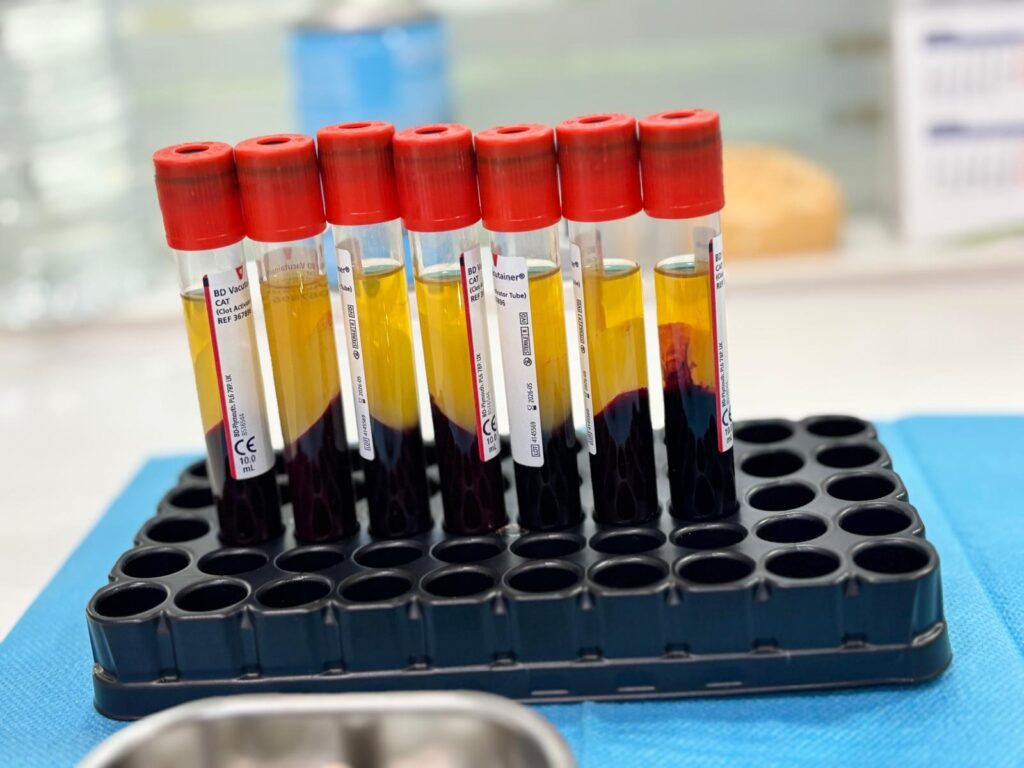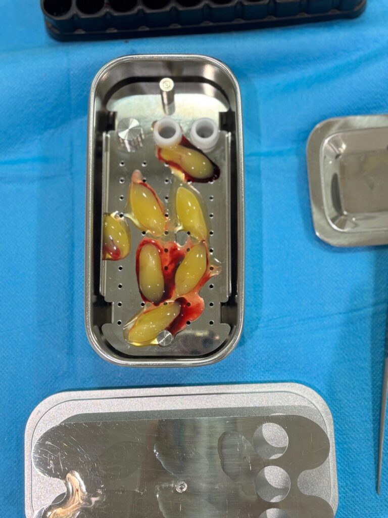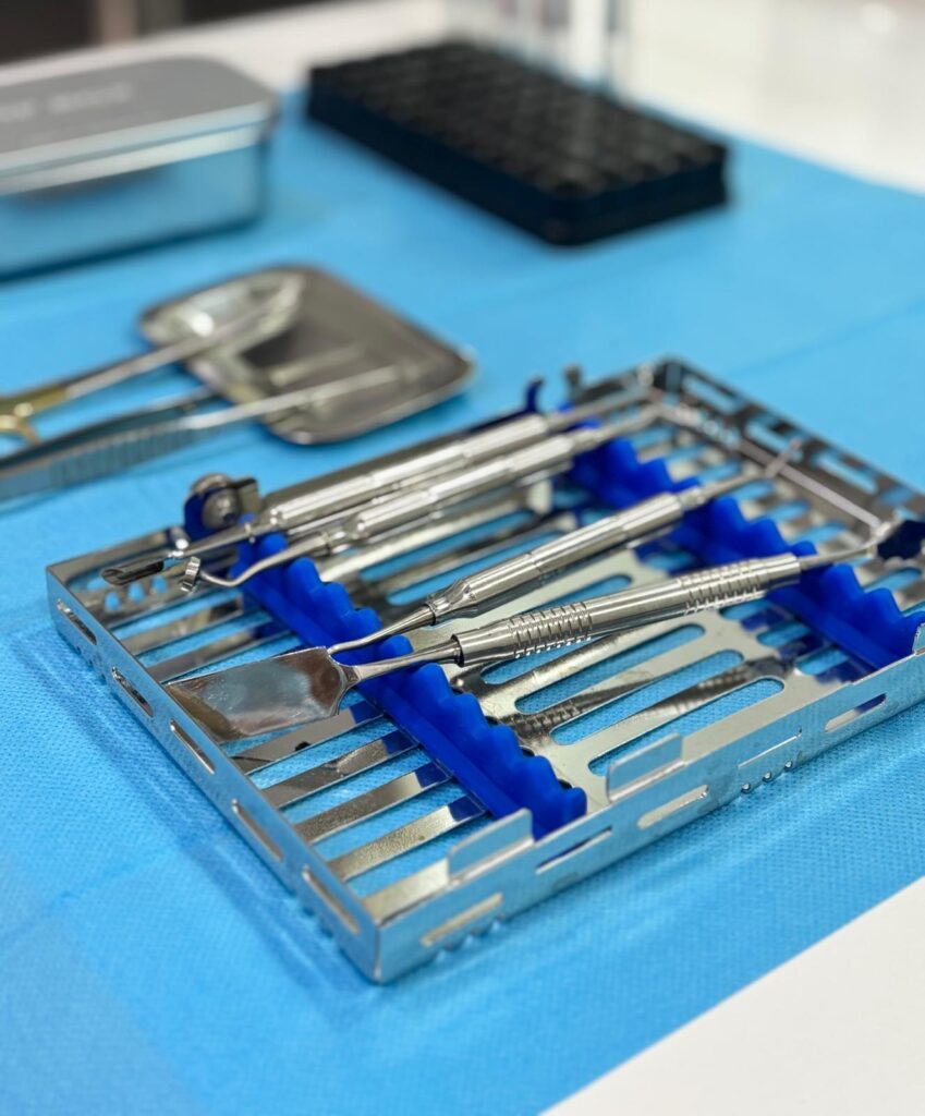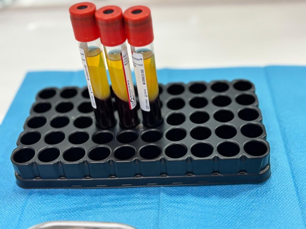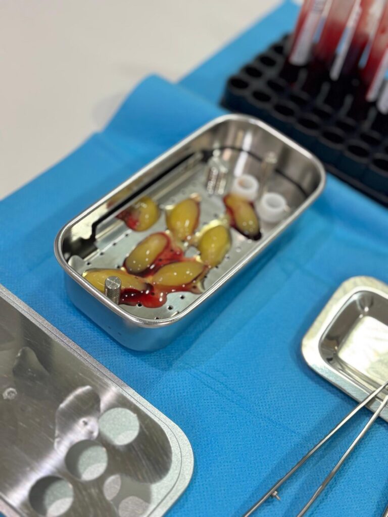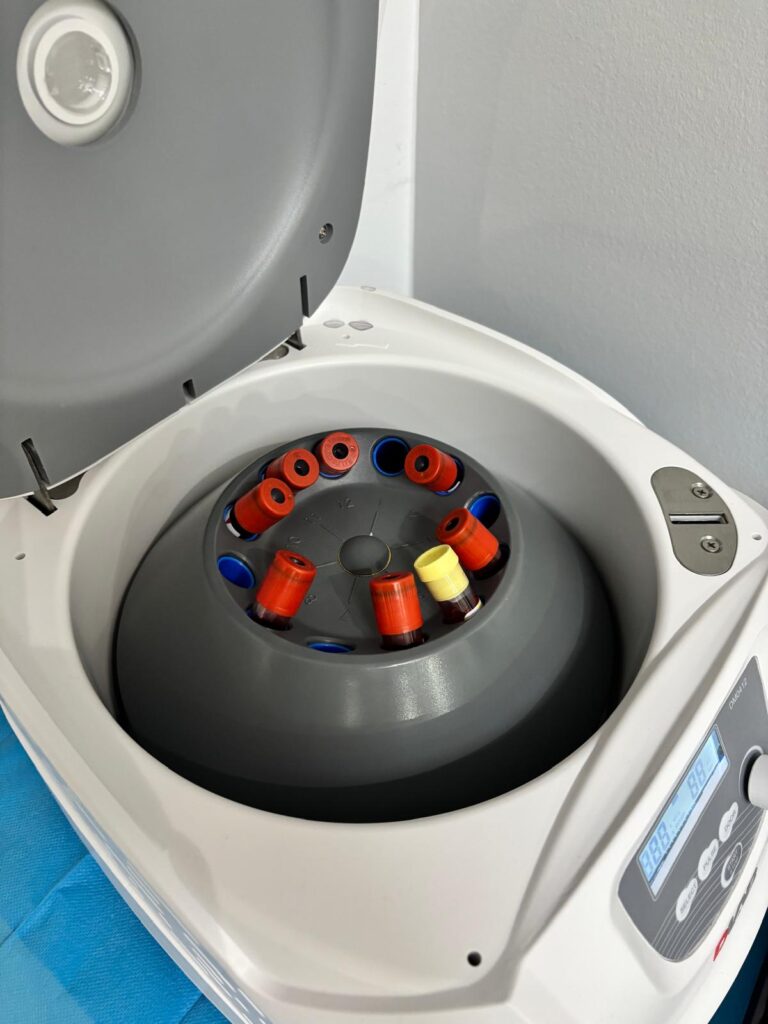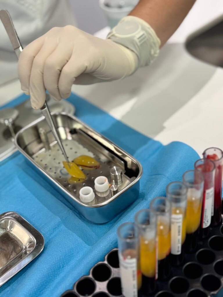 En nuestra clínica lo realizamos a partir de una pequeña cantidad de sangre extraída al paciente en el mismo momento de la cirugía, como un análisis de sangre convencional, se obtiene la L-PRF, fibra rica en plaquetas y en leucocitos.